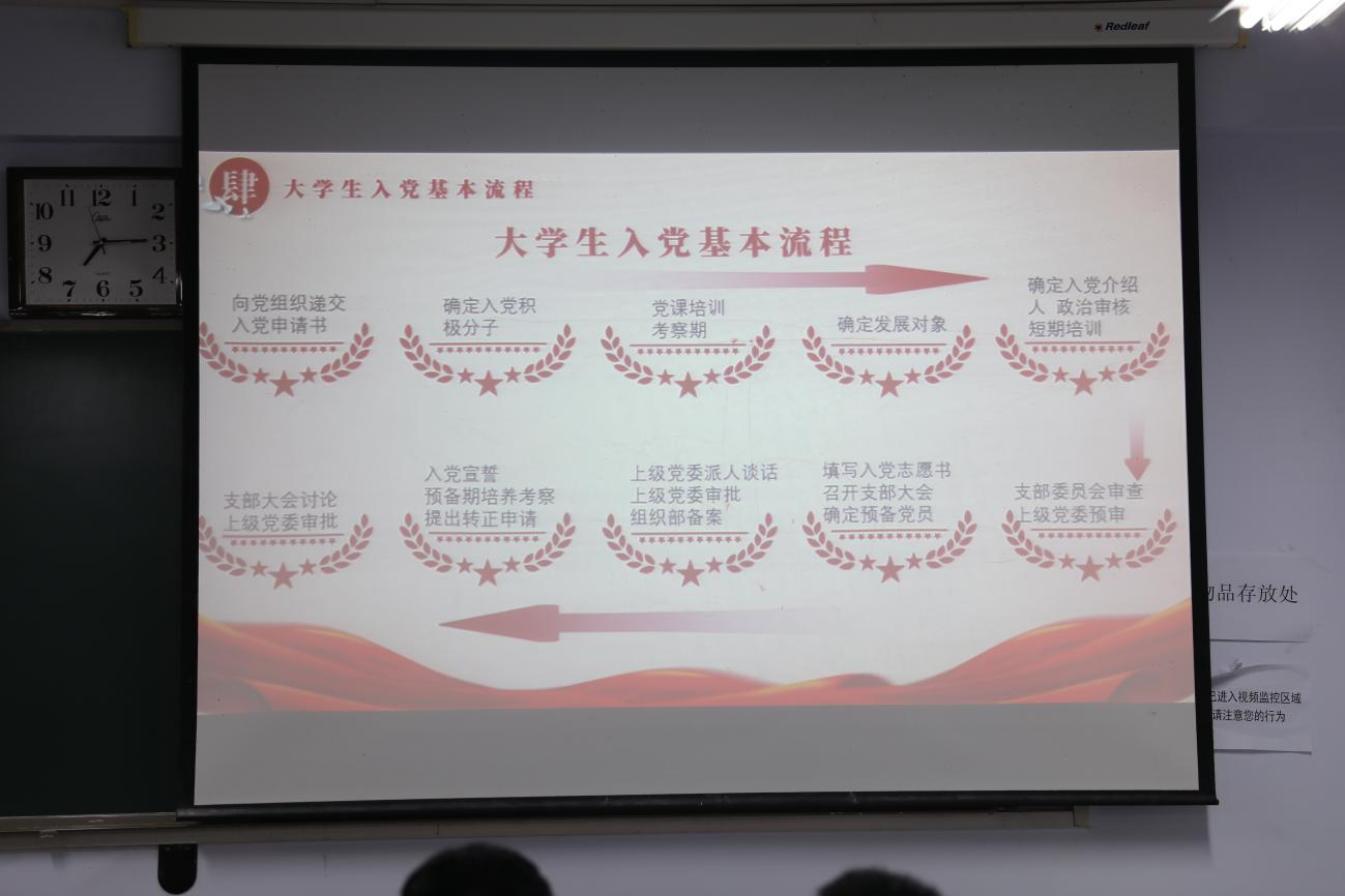 此次宣讲会以“建功立业新时代,不负青春不负党”的为主题,从“党的基本知识”“当代大学生的历史使命”和“大学生入党流程及条件”等三个方面,生动阐述了党的光辉历程和基本知识,并组织开展知识问答环节,引导同学们坚定理想信念、放飞青春梦想,志存高远、脚踏实地,谱写大学时代新篇章,以实际行动向党组织靠拢。参加宣讲会的新生纷纷表示,此次讲座内容丰富,让他们对于高校党组织的作用、党的历史知识以及入党流程有了更加清晰的认识,并将以实际行动在学习和工作中创先争优,争取早日加入党组织。