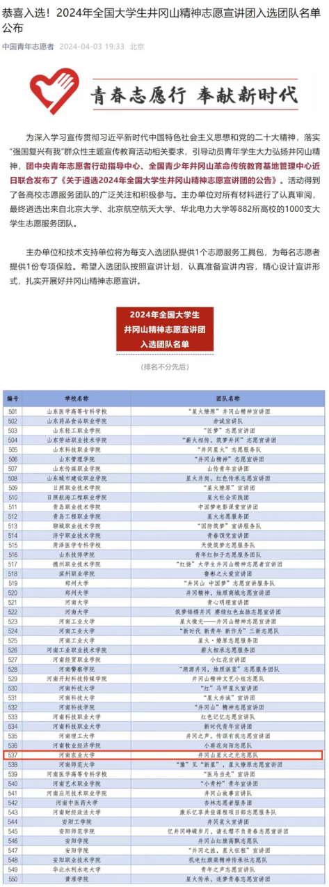 团中央青年志愿者行动指导中心、全国青少年井冈山革命传统教育基地管理中心近日联合发布了《关于遴选2024年全国大学生井冈山精神志愿宣讲团的公告》,H动画井冈山星火之光志愿队成功入选,是此次志愿宣讲招募活动中我校唯一一支入选团队。
