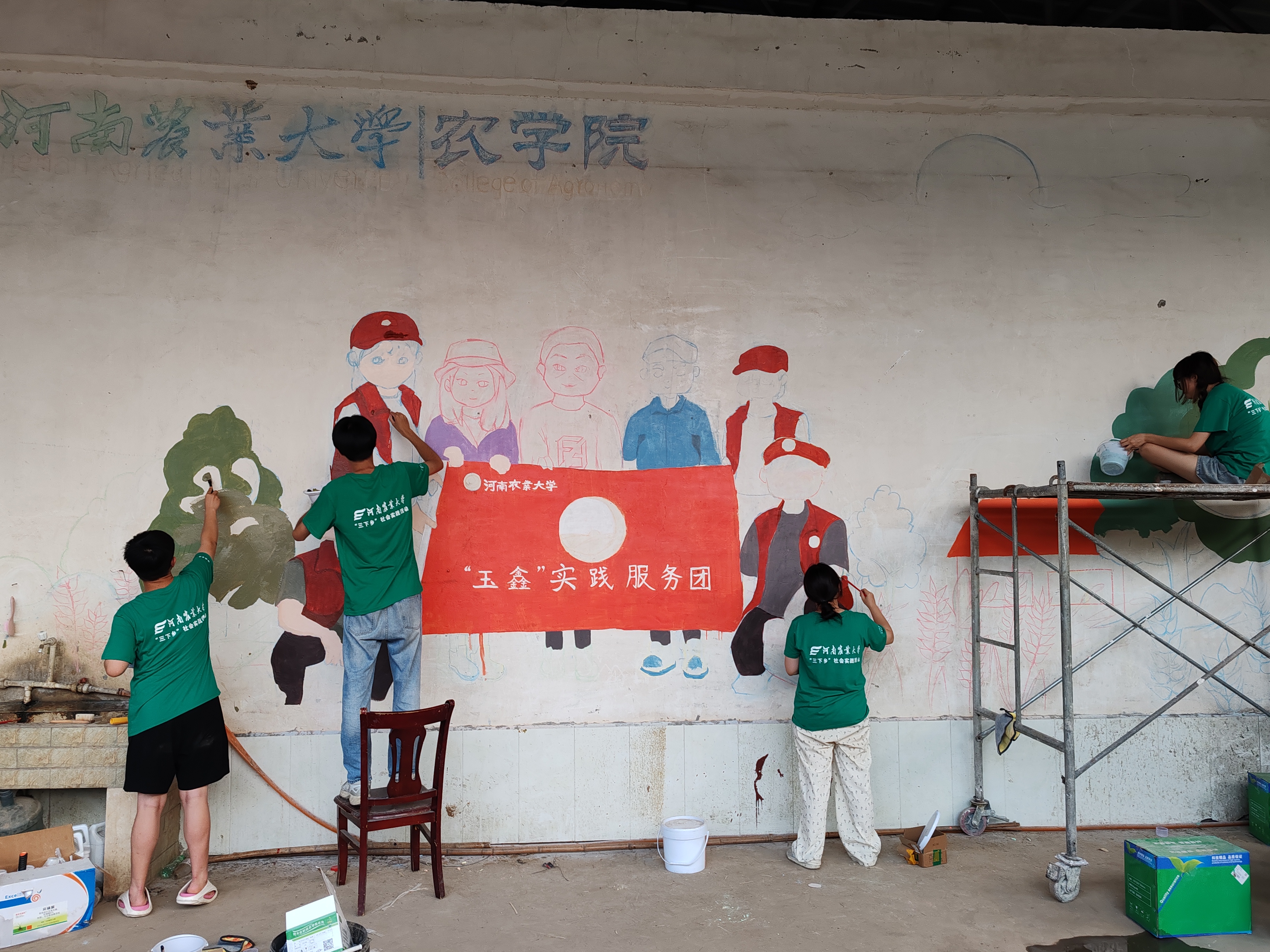 实践团成员与农H动画 “科技小院”成员相互讨论,积极构思,最终确定了墙绘方案。准备妥当后,H动画志愿者开始投身墙绘工作。团队成员们手持画笔和颜料,以墙为纸,认真细致地设计墙绘内容及构图,分工明确,一丝不苟,希望通过自己创作的艺术墙绘,为椹涧乡的乡村振兴建设增添美学气息。