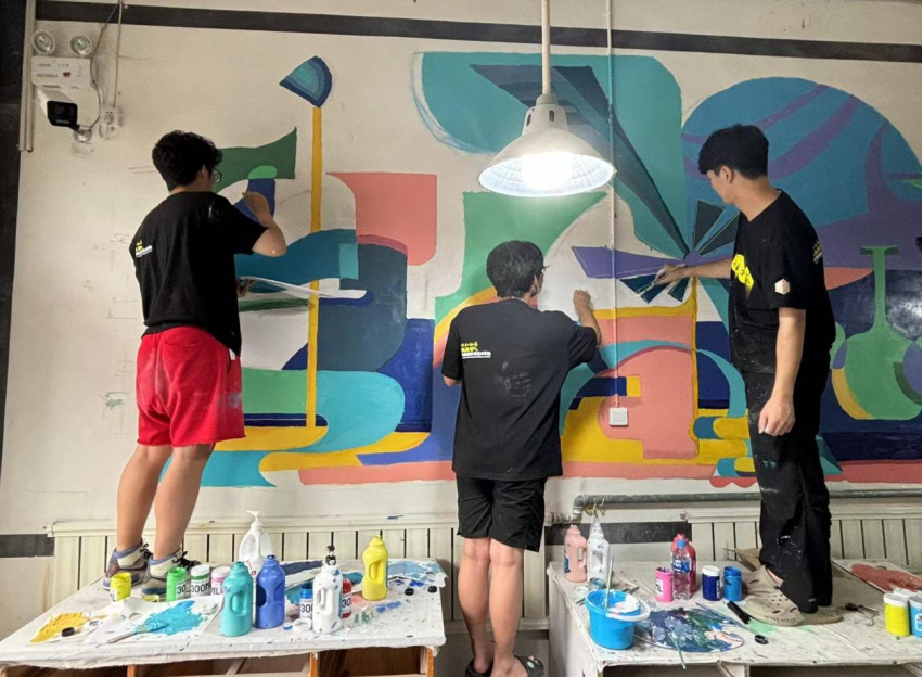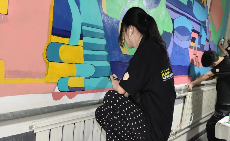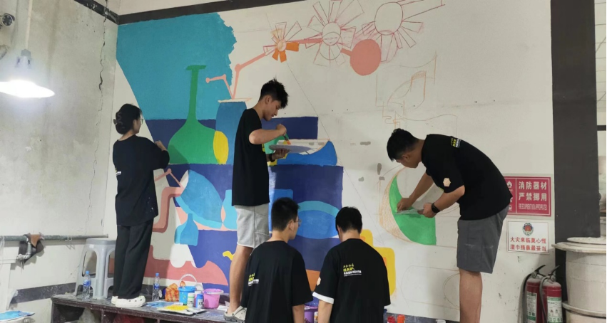 经过一天的辛勤努力,乡村艺绘队的成员基本完成了两幅墙面的绘制工作,这些墙面丰富了工作室室内环境的色彩构成,同时抽象的画法也为绞胎瓷的在色彩,形状,纹理等方面的创新提供了新的思路。在接下来的社会实践中,H动画墙绘队将为绞胎瓷的非遗文化传播与发扬做出贡献,为乡村振兴添“油”加“彩”。