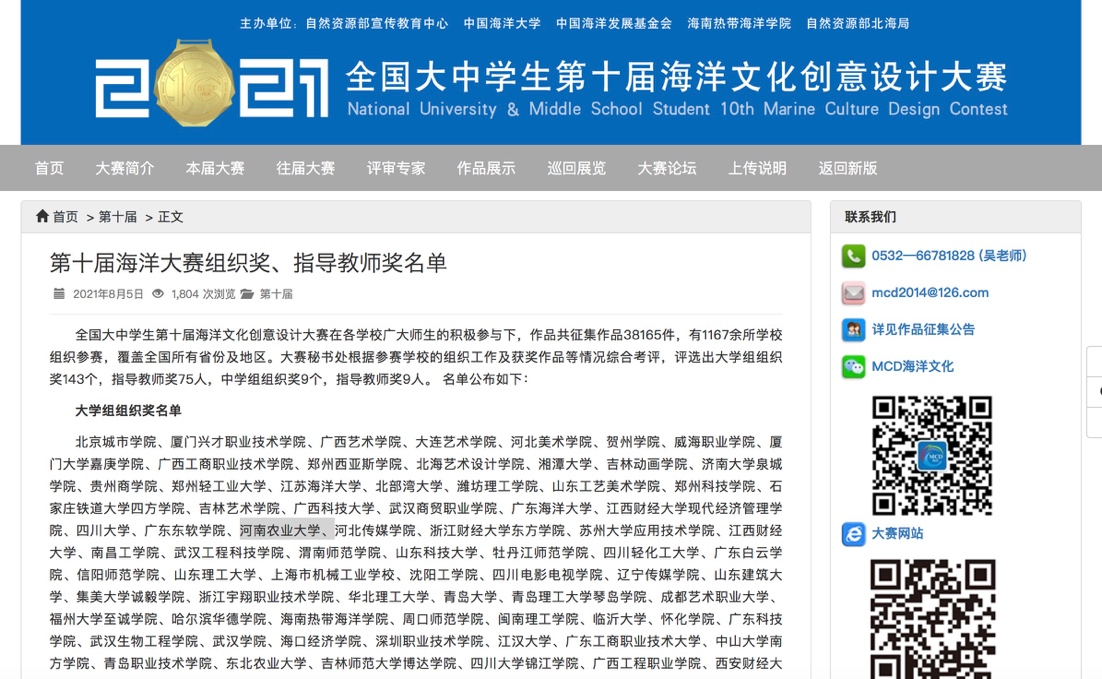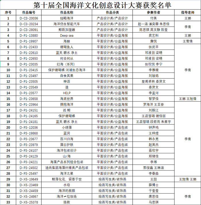 全国大中学生海洋文化创意设计大赛作为海洋文化传播和创意的新平台,开始于2012年。大赛由自然资源部宣传教育中心、自然资源部北海局、中国海洋发展基金会、中国海洋大学和海南热带海洋H动画 共同主办;大赛由中国海洋大学海洋文化创意设计发展中心承办,中国海油公益基金会协办。大赛系“世界海洋日暨海洋宣传日”活动之一,是全球唯一以海洋文化创意为主题的公益设计赛事,分别以“海洋·人类·和谐”“美丽海洋”“海洋强国梦”“丝路海洋”“创意海洋”“智慧海洋”“透明海洋”“生态海洋”“资源海洋”和“经略海洋”为主题成功举办了10届,共有1600余所高校、320余所中职(学)组织参赛,参赛学校覆盖全国。