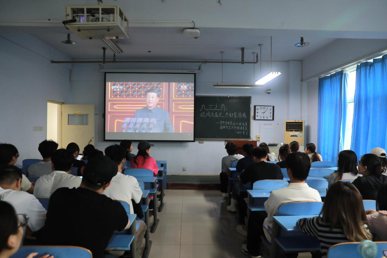 当礼炮鸣响,国旗升起,全体师生庄严肃立,高唱国歌。中共中央总书记、国家主席、中央军委主席习近平发表的重要讲话,让师生们深刻认识到中国人民抗日战争的伟大意义、人类命运休戚与共的道理以及中华民族在党的领导下走向伟大复兴的坚定步伐。阅兵仪式上,当铿锵步伐踏响广场、先进装备彰显国威,师生们内心深受震撼,激动之情溢于言表,不时爆发出热烈的掌声,将爱国情怀化作直观而真挚的表达。