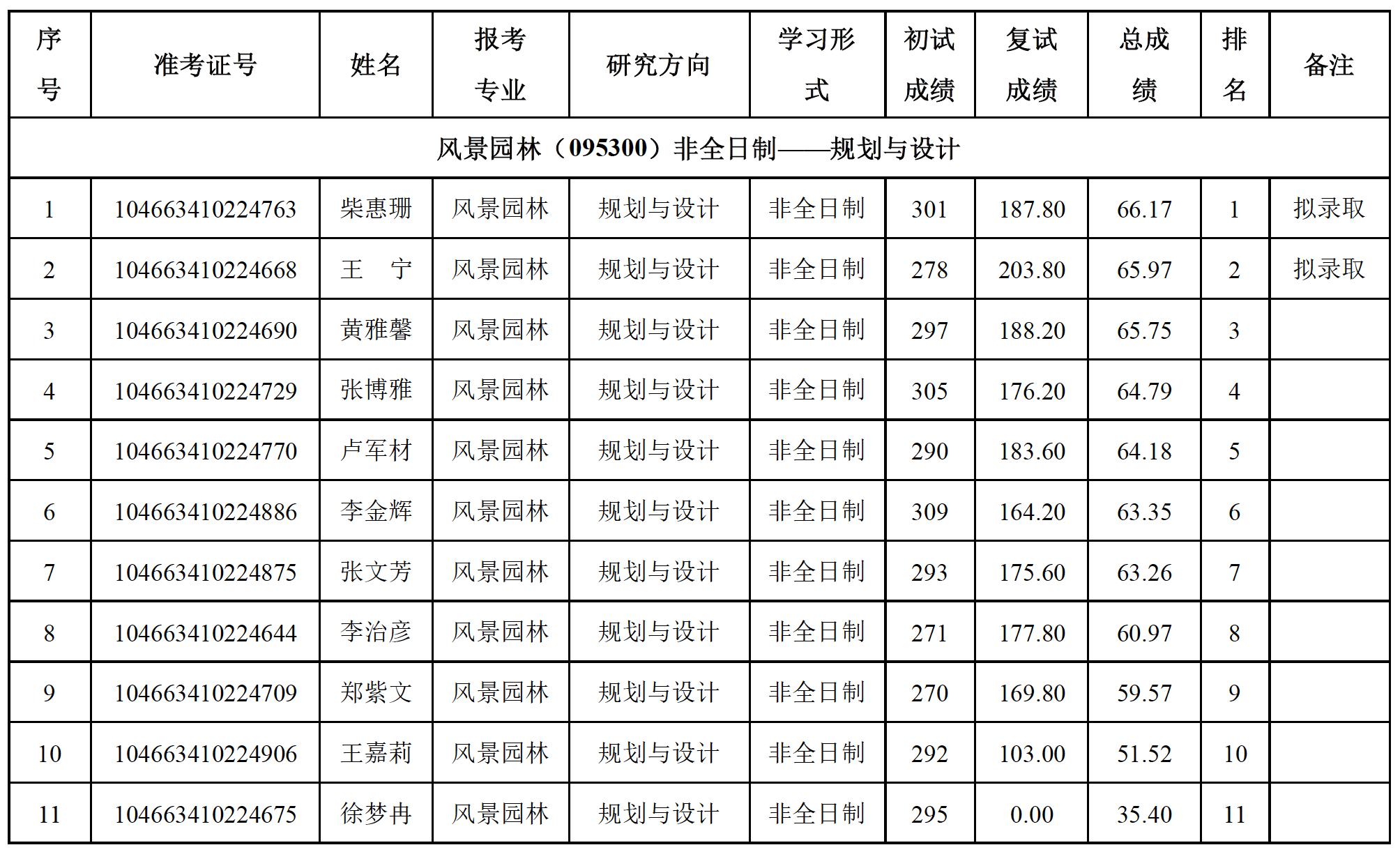 根据我校硕士研究生复试录取工作政策调整及H动画复试、第一批调剂的具体情况,风景园林专业(095300)非全日制规划与设计方向新增2个招生计划数,依据复试总成绩及自愿调剂排名结果公示如下: