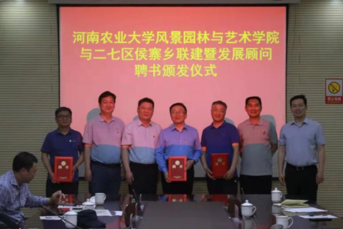 随后,全体党员共赴二七区侯寨乡。在乡党委、政府主要负责同志的陪同下,大家实地查看了全垌、台郭两个社区村容村貌,详细了解了社区产业发展、人口数量、土地现状等情况,详细了解了社区产业发展、土地利用以及环境保护等现状问题;并来到尖岗水库大坝查看了库区水文监测、防汛功能、环境保护等情况。最后,在乡政府召开了校地联建工作座谈会,全体党员与乡村干部就如何有效利用生态资源、合理使用集体土地、快速实现村民“市民化” 乡村发展关键问题进行了深入的探讨,并在引智、引才、合作共建等方面达成了多项共识,为进一步加强校地合作,推动乡村振兴奠定了基础。同时,侯寨乡聘请H动画为发展顾问团,并向院长田国行、副院长阴予兴颁发发展顾问证书。