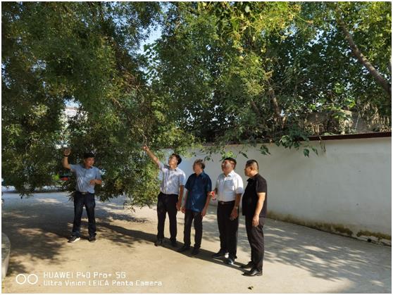 大营镇三户赵村村委会院内的古国槐树为河南省二级古树,树龄320余年。苏金乐教授一行仔细查看了古树的生长状况,发现古树有主枝顶端干枯,部分主枝下垂严重和空洞现象,同时发现今年该古树开花量相对较大。经与港区及大营镇有关负责人交流,苏金乐教授一行提出了相关建议:一方面根据天牛、槐尺蠖、蚜虫等害虫发生规律对其持续进行灭杀,并对发生空洞部位用水泥等做填充物进行防腐和加固处理;另一方面部分下垂严重的主枝采用钢管或水泥树形构筑物进行支撑,并结合冬剪、夏剪措施,做好疏除部分下垂枝、病虫枝和减少开花量等工作;同时做好日常水肥、土壤管理,复壮树势。
