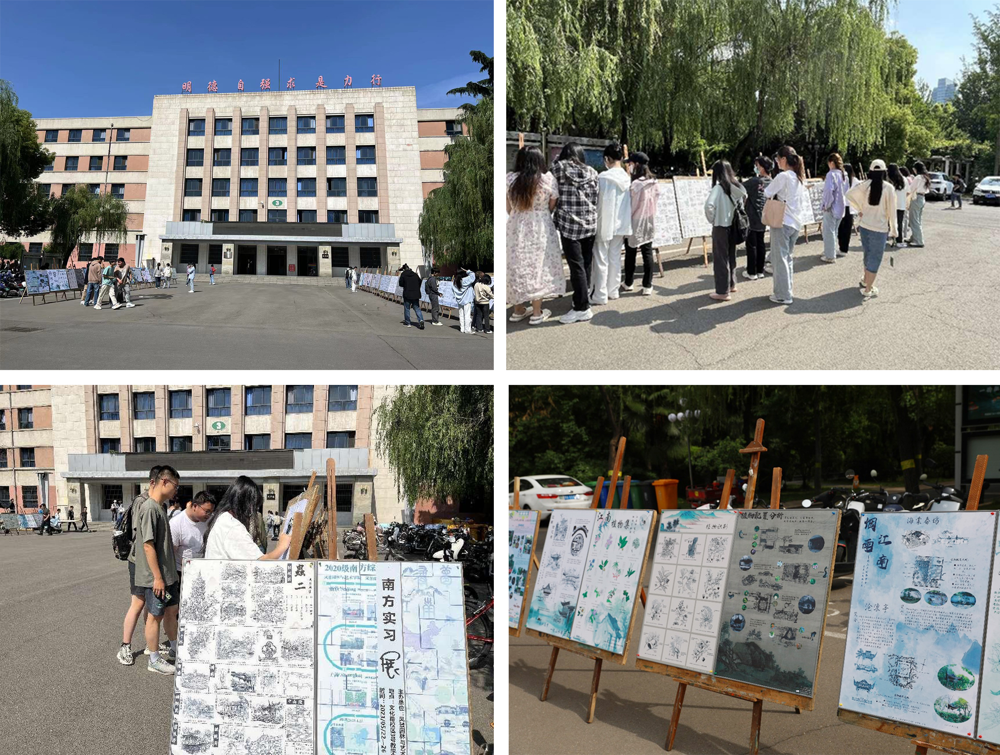 本次南方综合实习展为期一周,主要展示了 风景园林与园林专业师生在对上海、南京、杭州武汉、苏州等城市进行的实践教学成果。师生们为大家呈现的展板作品共60余幅,详实地展示了江南古典园林的造景手法,南方园林植物的种类、习性与种植设计,江南地区古遗址的保护策略,南方城市更新策略,江南城市与自然景观融合方式等内容。景园专业和园林专业学生纷纷表示受益匪浅,通过观展,激发了他们对专业学习的动力。