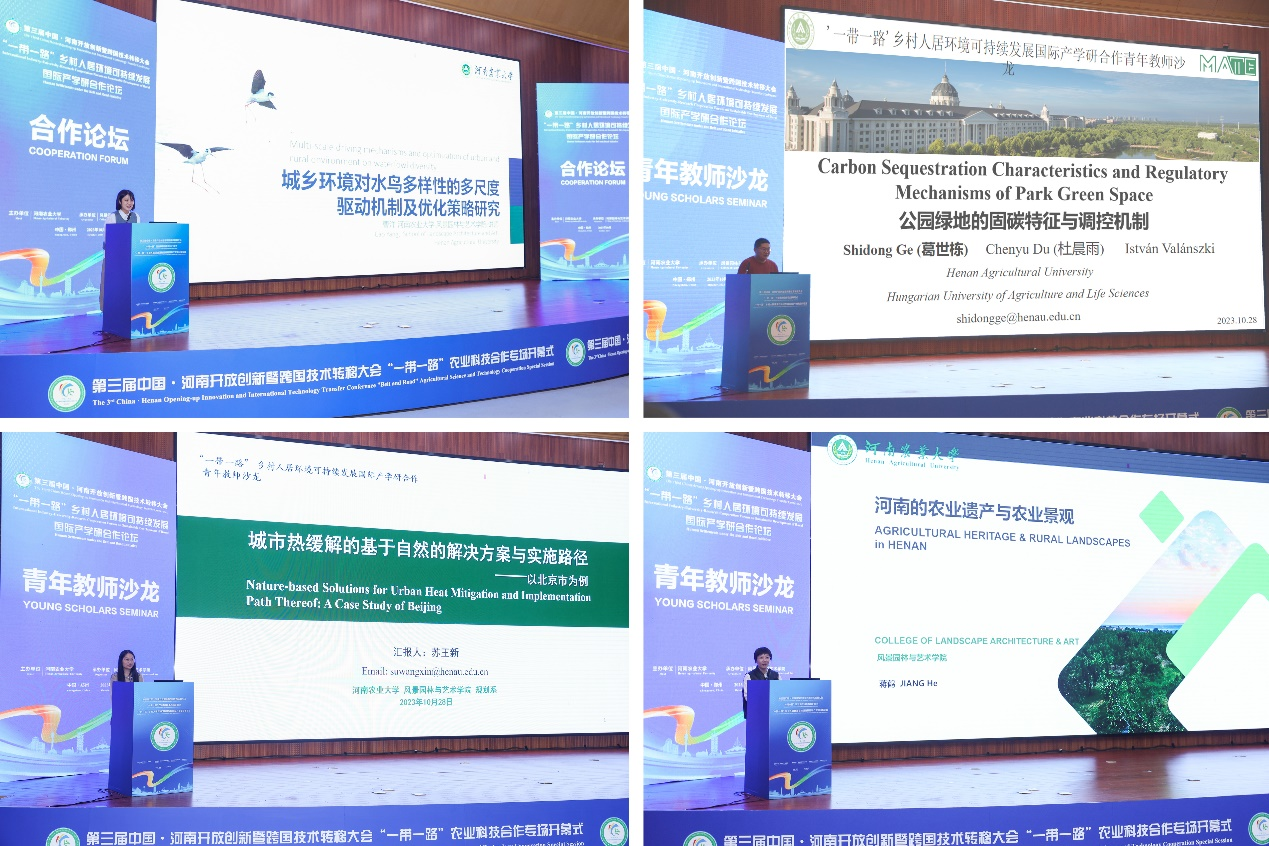 的4名青年教师曹洋、葛世栋、苏王新、蒋鹤分别就城乡环境对水鸟多样性的多尺度驱动机制及优化策略、公园绿地的固碳特征与调控机制、城市热缓解的基于自然的解决方案与实施路径、河南的农业遗产与农业景观等方面的研究内容进行了精彩的汇报。