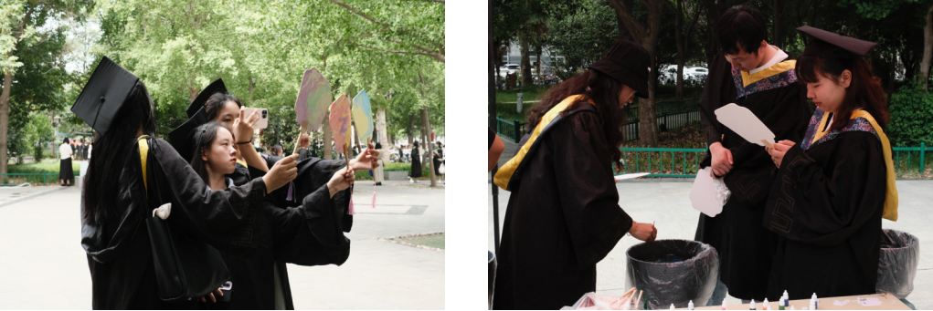 会后,在校礼堂东台阶前,出席典礼的领导、老师和毕业生合影留念。随后毕业生们前往牧医广场进行漆扇创作,以漆为墨,以水为笔。从白扇到流光溢彩的漆扇,从初入校园时的懵懂青涩到毕业时的风华正茂,一把把独一无二只属于自己的漆扇 ,给毕业生们四年的大学时光画上纪念的符号。以独创的漆扇祝愿毕业生们每个人都能在未来的道路活出自己的精彩,做独一无二的自己。