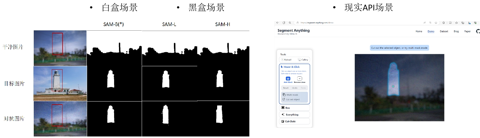 本项目从自然变化鲁棒性和对抗扰动鲁棒性两个角度开展了零样本图像分割模型多维度鲁棒性测试研究,针对现有零样本分割大模型鲁棒性评估全面性不足,同时面向这类模型对抗攻击算法场景单一,迁移性能不足的现状,项目成员设计自然变化鲁棒性测试模块,是生成15种自然风格变化图片,经测试会对分割结果产生负面影响。在对抗扰动鲁棒性模块,设计了黑盒、白盒、API的多个场景对抗攻击,如图1。