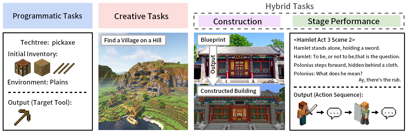 我们提供三类Benchmark(Programmatic、Creative、Hybrid),构造了包含6053个任务的数据集,并且首次提出建造和剧本演出两种适合多模态Agent进行的任务。