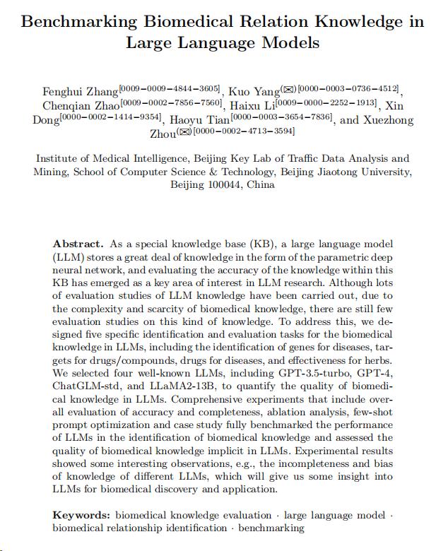 本项目旨在利用先进的大语言模型(如GPT-4)构建一个全面的医学知识图谱,并设计了一个多维度的评估框架,评估大语言模型在生物医学领域知识的准确性和完整性。通过对比不同大语言模型的知识图谱生成结果,提取和组织医学领域的重要信息,包括疾病、症状、治疗方案、药物、方剂和证候等。项目的主要工作围绕大语言模型生物医学知识的评估展开,设计并实施多维度的实验进行验证和测试。与此同时,我们开发了一个智能问答系统,结合医学知识图谱,为用户提供便捷准确的医学知识问答服务,并进行初步的机器人问答系统开发。该项目致力于解决医学领域知识获取与共享的挑战,提供高效、准确的医学知识服务,提升医学研究者、医生和患者的知识获取效率和决策支持能力,具有显著的科研价值和应用价值。