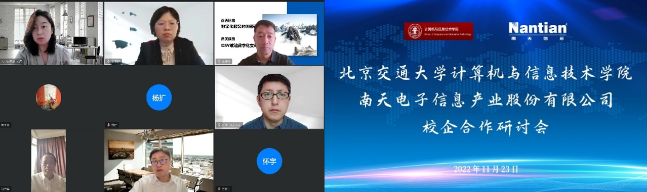 2022年11月23日上午,校友企业南天电子信息产业股份有限公司(以下简称“南天信息”)副总裁倪佳、北京南天信息工程有限公司董事长、总经理兼软件业务集团执行副总裁陈卓慧等十人与计算机与信息技术学院副院长景丽萍、信息安全系主任王伟及相关教师等就科学研究合作等方面进行了可能性探讨。