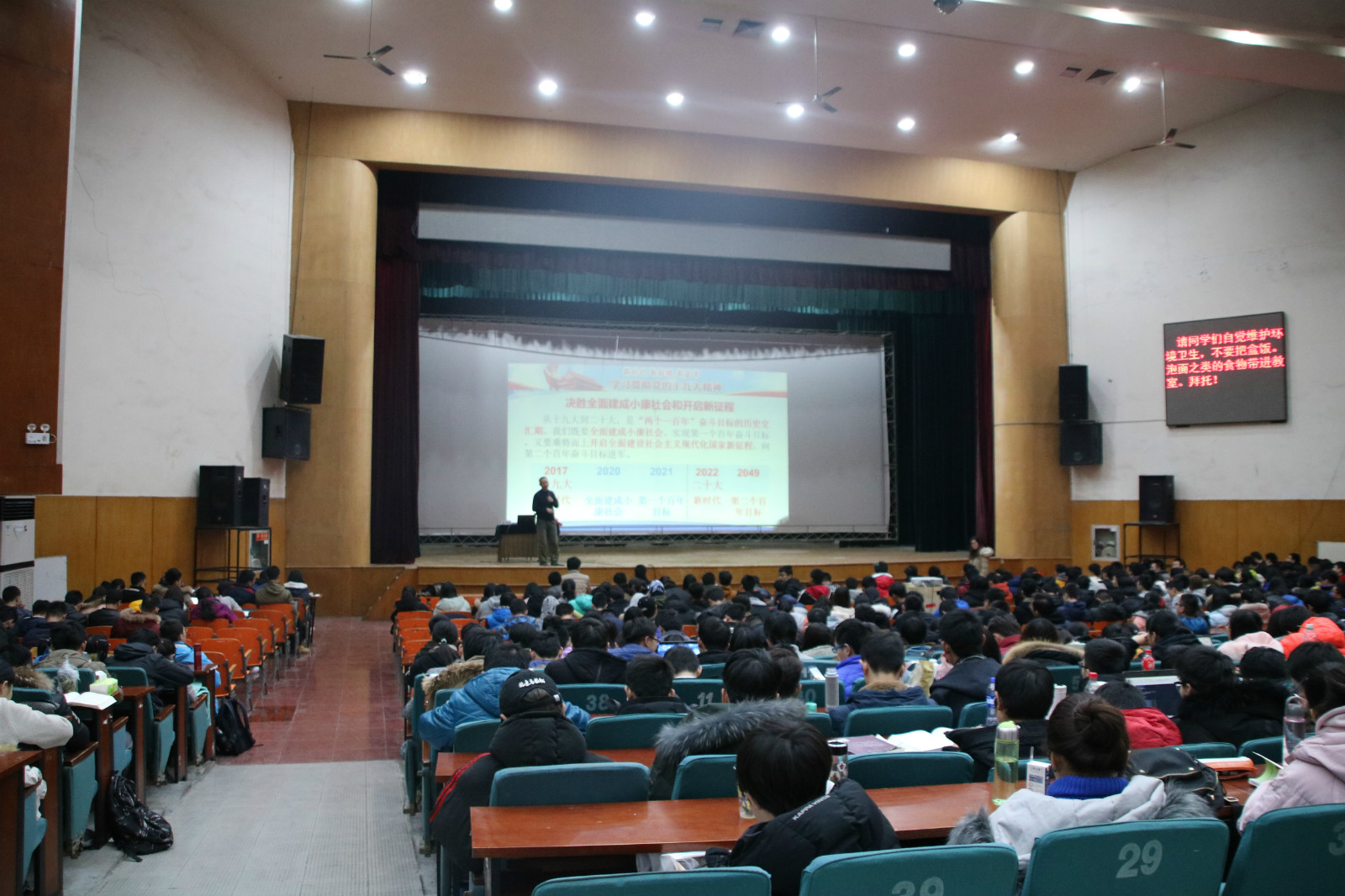 李效东老师结合十九大会议精神,对新时代中国的发展模式、发展方向和国际比较等方面内容做了详尽的阐释,高屋建瓴地讲述了“新时代、新征程、新篇章”的内在含义,帮助同学们对中国国情有了更加清晰的认识,对中国未来有了更加无限的向往,为同学们制定今后的学习和生活目标产生巨大的指导作用。讲座现场气氛热烈,李老师幽默诙谐的语言和渊博深厚的学识博得了同学们的阵阵掌声。最后,讲座在热烈的气氛中圆满结束。