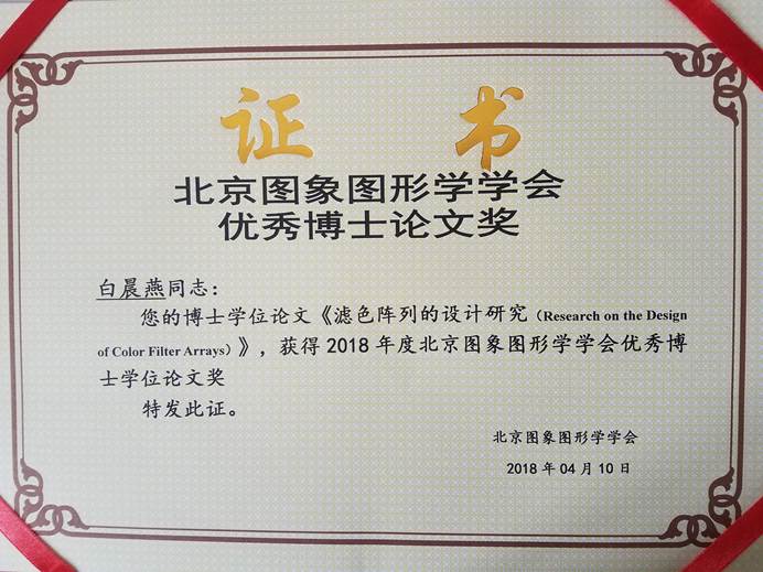 白晨燕的论文针对滤色阵列的设计问题,提出了不规则像素滤色阵列、自动化设计滤色阵列的方法,以及低光照条件下滤色阵列的设计方法,相关成果发表在本领域重要刊物IEEE Trans. on Image Processing。