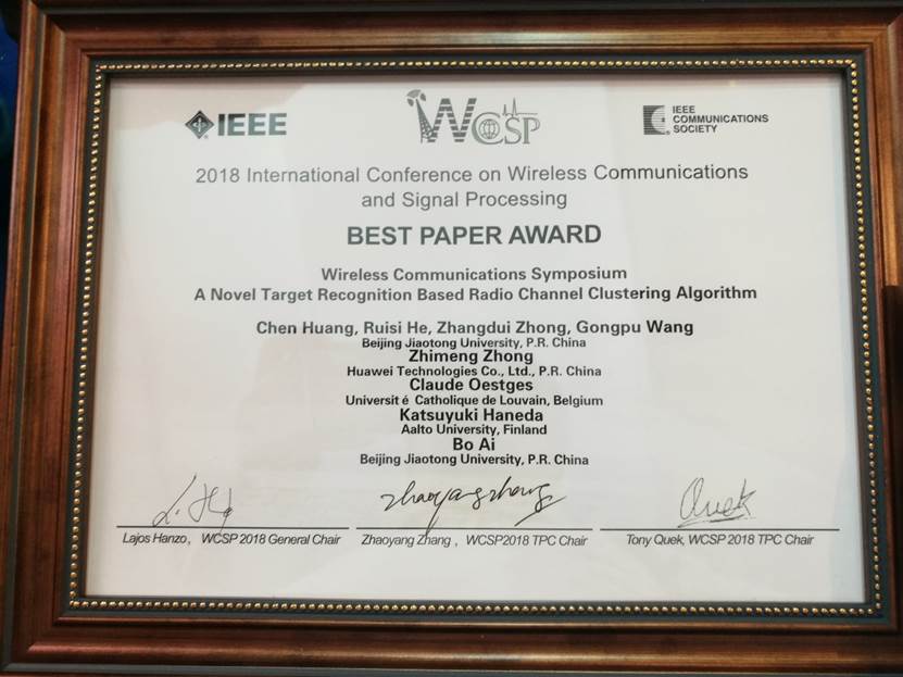2018年10月17至19日,第十届无线通信与信号处理国际学术会议在杭州召开,H动画 2016级博士生生黄晨在何睿斯副教授和钟章队教授指导下撰写并发表的论文“A Novel Target Recognition Based Radio Channel Clustering Algorithm”获这次会议最佳论文奖。本次会议共收到700余篇投稿,最后共录用287篇文章。