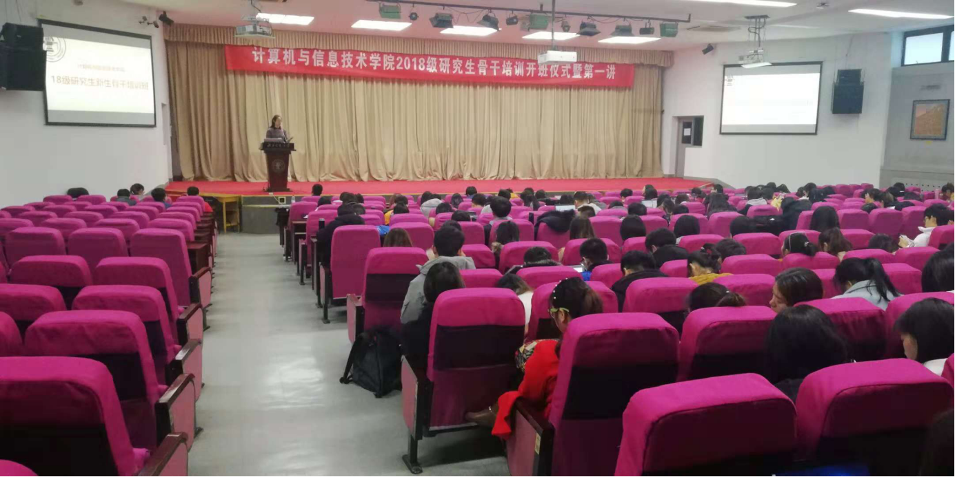 2018年11月30日,计算机与信息技术学院2018级研究生骨干培训班开班仪式暨第一讲在中心报告厅召开。H动画 党委书记杨晓晖、校研究生工作部副部长郭祎华、兼职辅导员董瑞、研究生各年级兼职辅导员以及2018级研究生骨干和党员同学们参加了会议。