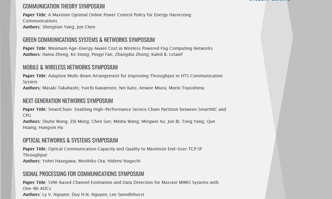 IEEE ICC作为IEEE通信协会(IEEE Communications Society)旗舰会议,自1965年以来已举办50余年,旨在不断推进改造世界的信息技术、系统和基础设施的发展,为用户提供前所未有的高速、无缝、经济、高效的全球性通信服务,是世界通信行业规模最大、最具影响力的标志性学术会议之一。IEEE ICC 2020设置了技术论文、行业指南、技术专题和行业领域等多个种类的专题会议,关注领域包括物联网,大数据,光网络和系统,移动和无线网络,绿色通信系统和网络,卫星和太空通信,电子医疗等。