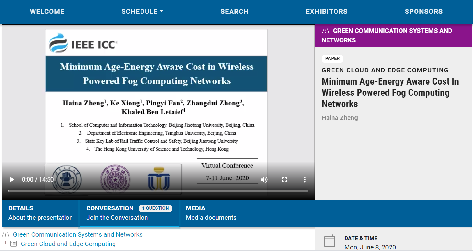 6月7日-6月11日,原定于爱尔兰都柏林召开的第54届IEEE国际通信大会(IEEE International Conference on Communication, IEEE ICC)受COVID-19疫情影响改在线上召开。由H动画 信息通信网络研究所和轨道交通控制与安全国家重点实验室合作完成的学术论文“Minimum Age-Energy Aware Cost in Wireless Powered Fog Computing Networks”经过专题技术委员会评审和推荐,从提交的近2100余篇论文中脱颖而出,荣获最佳论文奖(Best Paper Award)(本次IEEE ICC最佳论文奖获奖比例为0.72%)。