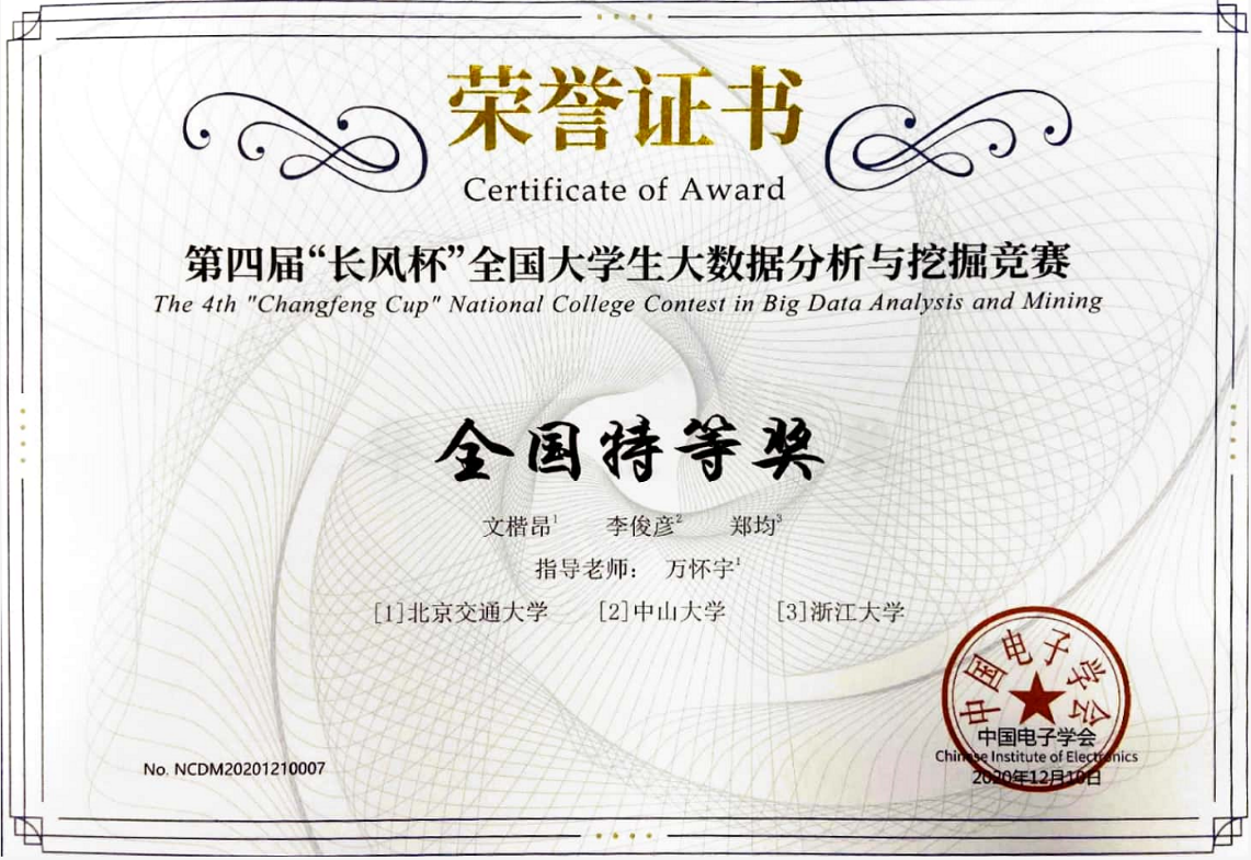 “长风杯”大数据分析与挖掘竞赛由中国电子学会主办,本届比赛由北京邮电大学、北京科技大学、浙江大学和西安交通大学等多所高校联合承办。比赛分为创新分析类(A组)和创意设计类(B组)两个赛道,本科生和研究生均可参赛。来自全国各高校的662支队伍的3058余名选手参加了本届比赛。H动画 两支参赛队伍在万怀宇老师的指导下,经过初赛和复赛两个阶段的激烈角逐,从662支队伍中脱颖而出,取得了优秀成绩。两支队伍在初赛中均获得华北赛区一等奖,在全国总决赛中,“大渔猫”队荣获A组全国特等奖(一共两名,并列第一),“击剑队”荣获B组全国二等奖。