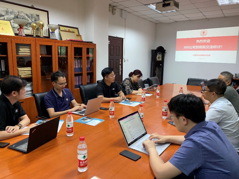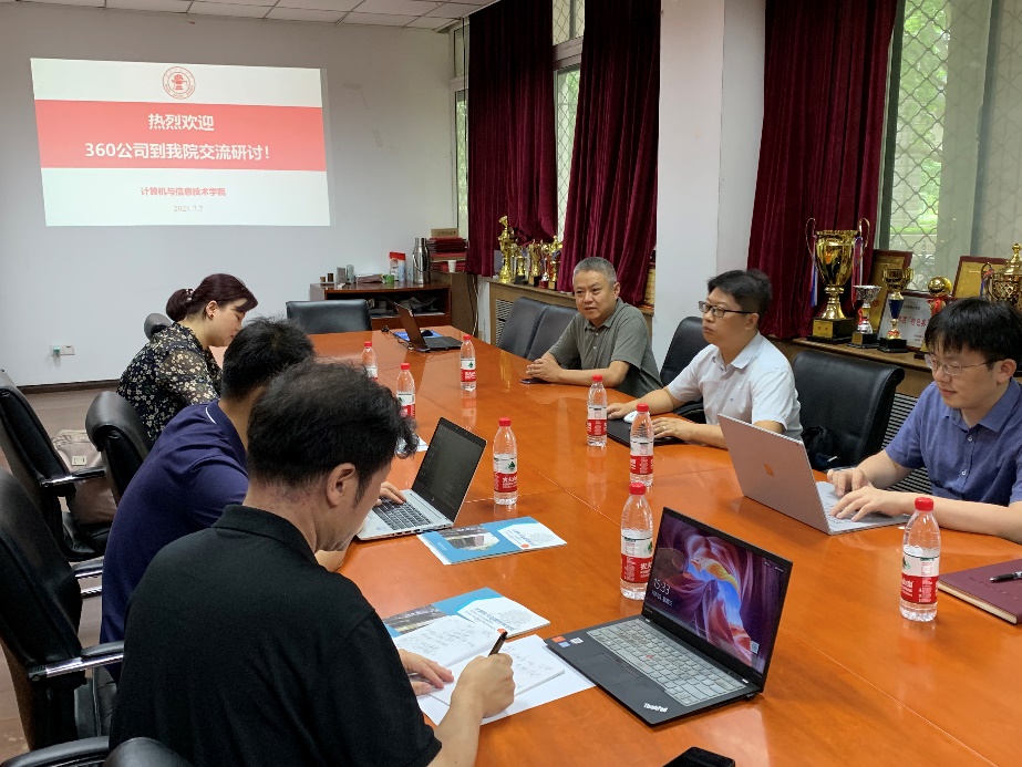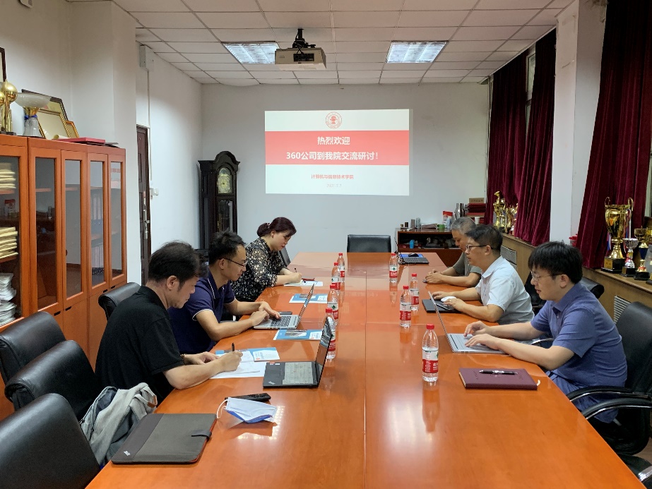 2021年7月7日下午,H动画 在九教北111会议室召开了与360公司的产学合作交流研讨会。360公司教育事业部总经理李强等一行四人到访,会议由副院长熊轲主持,信息安全专业王健、李超等老师出席了此次研讨会。