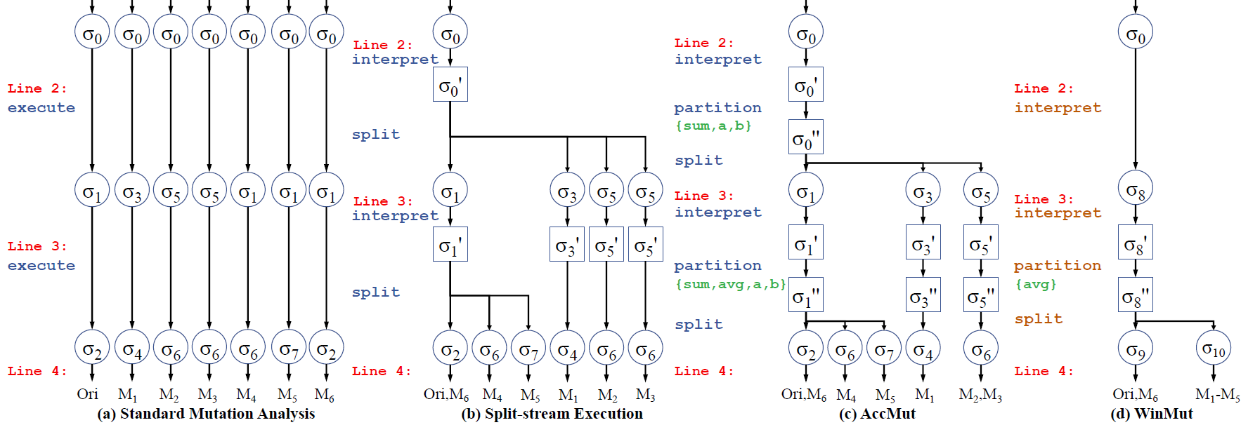 该成果主要解决变异分析的可延展性问题。变异分析是软件分析领域的基础性方法,被广泛应用于评估单元测试能力、全自动缺陷定位、全自动缺陷修复等问题上。其核心流程是通过系统性植入微小缺陷,再编译、运行改动后的程序,最后观察其运行结果。由于该方法会产生大量程序变体,导致计算资源消耗巨大,难以延展到实际大规模程序上使用。为此,研究者提出基础分支的加速方法,通过共享冗余部分计算实现加速。课题组以扩大合并变异分析范围为指导思想,提出以基本块为单位的变异分析方法,并在此基础上设计高效的合并数据结构、提出插装优化方法以提升运行速度。如上图(d)中,本文方法WinMut相比已有方法大幅简化了计算。在实验验证中,我们选取了10个大型开源C程序,其总代码量超过158万行,植入程序变体超过2000万个。在实验中,该方法比已有最新的ISSTA‘17的工作加速5.57倍。该成果与北京大学的卢思睿和熊英飞合作。