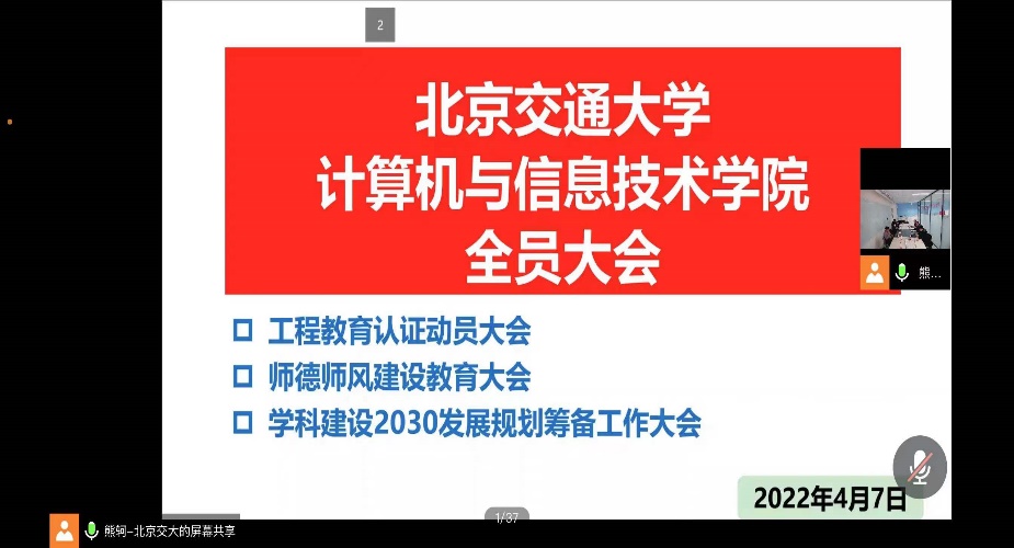 4月7日下午,为深入推进学院专业认证工作,H动画 在逸夫楼101会议室召开工程教育专业认证动员大会。会议由副院长熊轲主持,院长蔡伯根、党委副书记段春荣、韦世奎,副院长李浥东、景丽萍出席会议,H动画 全体教职工线上参加会议。