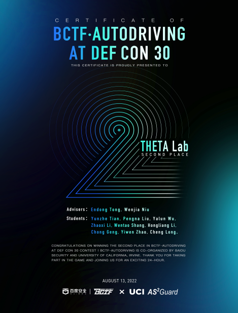 2022年8月14日零点,由百度安全(BCTF)和加州大学尔湾分校(UCI)联合承办的DEFCON 30 BCTF AutoDriving赛事圆满落下帷幕。H动画 网络空间安全学科责任教授刘吉强老师领队、信息安全系童恩栋老师和牛温佳老师指导的“THETA Lab”团队突破了23道赛题获得4310分,在百余支国内外高校战队中位列解题榜第二名。这是该团队在DEFCON(被称为黑客“奥斯卡”)的赛事中的第二次获奖,是对去年获奖的又一次沿袭。