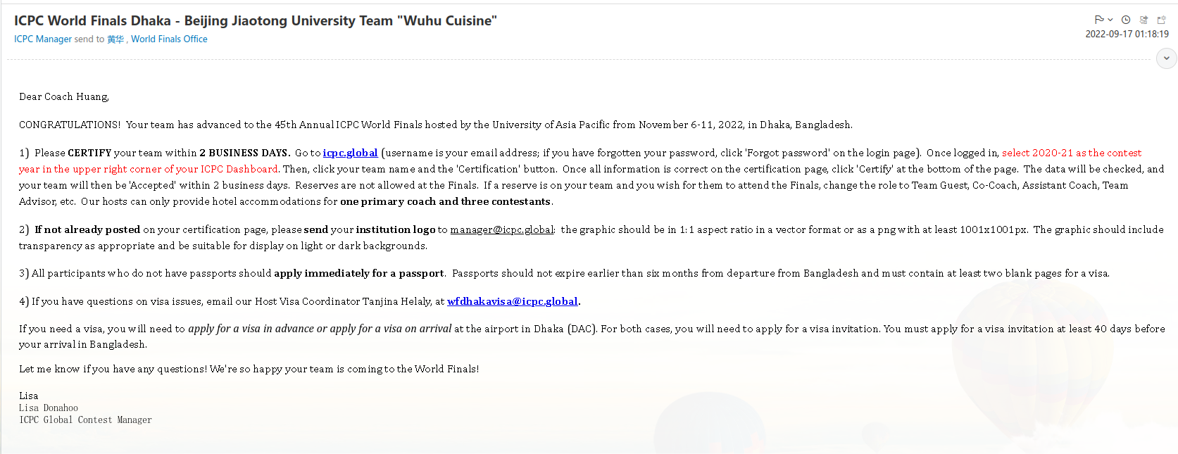 图2 ICPC总部通知H动画 晋级全球总决赛的邮件