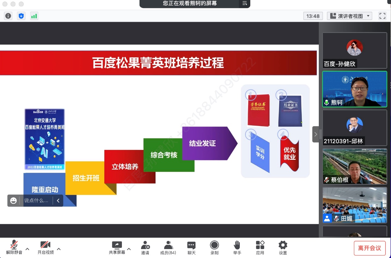百度公司松果菁英班班主任孙建欣向同学们详细介绍了菁英班的三大板块:课程教学、实践教学和AI竞赛。课程学习方面,百度提供包括人工智能相关教学资源包和职场规划线上线下课程等;实践教学方面,将提供包括海量题库的实践基地;在AI竞赛方面,将组织实践基地学生参与由百度组织的各项大赛和暑期训练营活动。