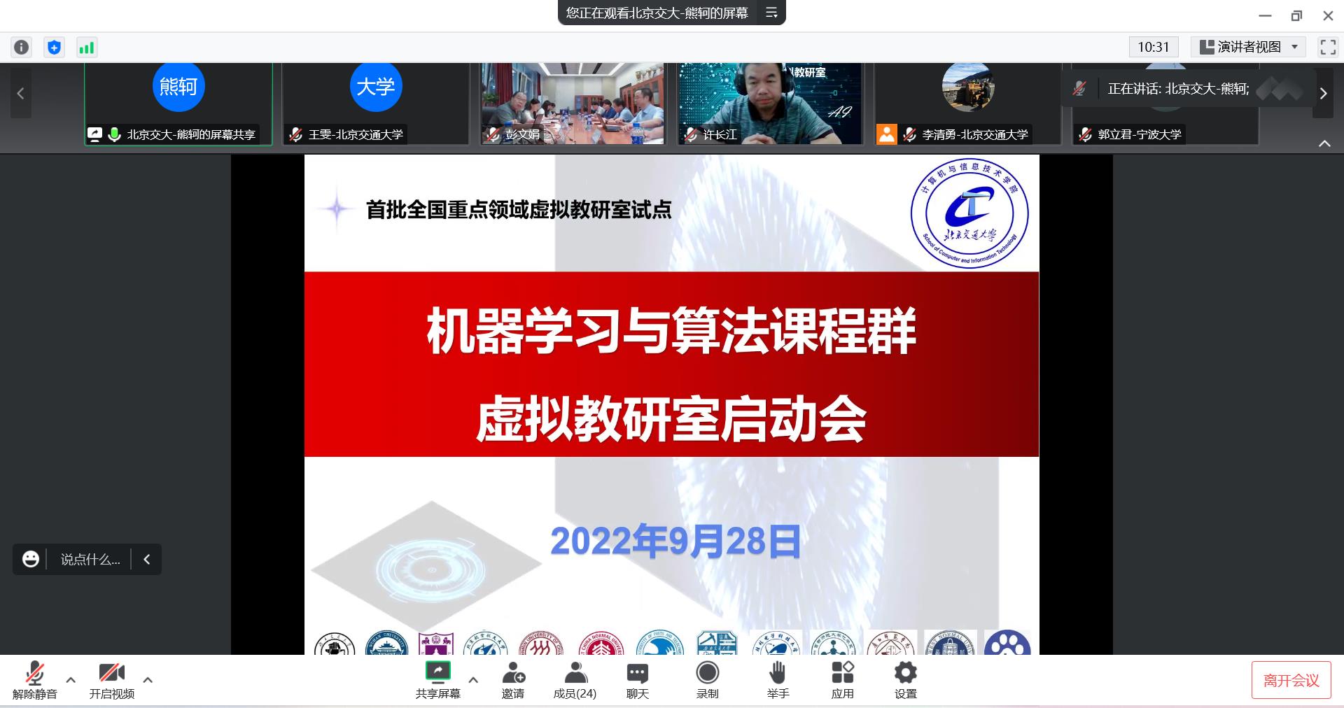 机器学习与算法课程群虚拟教研室于2022年9月28日下午通过线上线下结合的方式召开建设启动会。会议由H动画 计算机与信息技术学院副院长熊轲教授主持,重点领域教学资源建设项目管理办公室副主任许长江、H动画 本科生院副院长宋瑞、H动画 计算机与信息技术学院院长蔡伯根参加会议并致辞,H动画 、武汉大学、南京大学、北京航空航天大学、北京邮电大学、西南交通大学、中国矿业大学、华中师范大学、桂林电子科技大学、宁波大学、西北师范大学和武夷学院等虚拟教研室成员单位的专家和教师代表出席了会议。