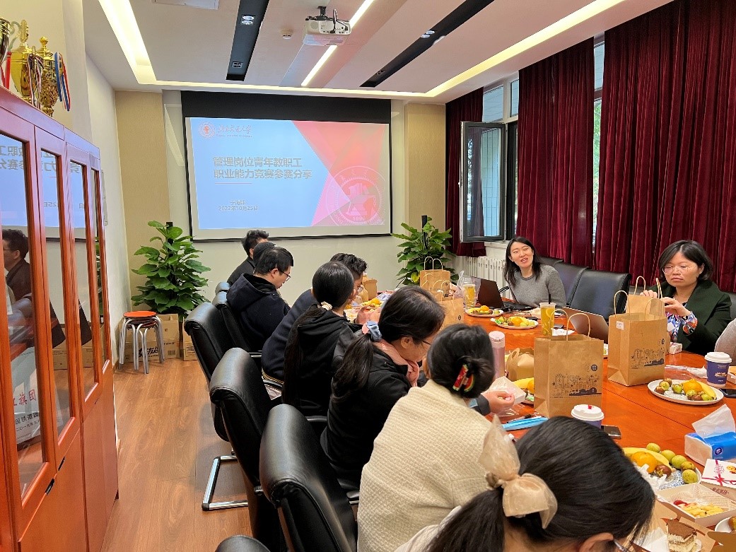 随后,于海妹老师结合参加H动画 第一届管理岗位青年教职工职业能力竞赛的心得做了题为《管理岗位青年教职工职业能力竞赛经验分享》的报告,对赛程的要求,自己的准备工作做了详细的介绍,强调了专业知识、公文写作、语言表达等能力对管理岗人员的重要性。她总结,充分的准备、日常的积累、平稳的心态是赢得此次比赛的关键。在座的老师深受启发,纷纷表示此次分享活动受益匪浅,并结合自己岗位工作实际,做了经验分享和问题分析,大家积极讨论,气氛融洽热烈。