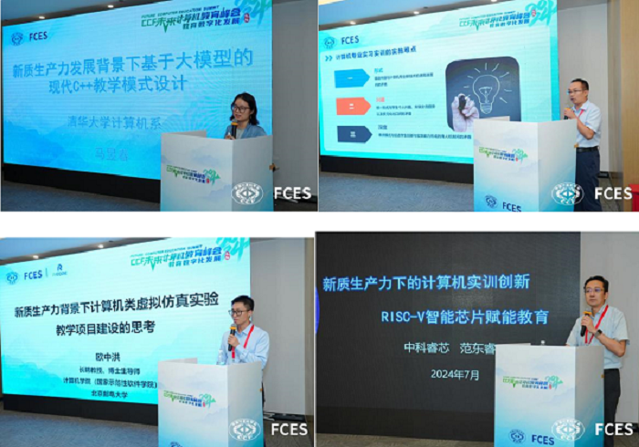 接着,清华大学马昱春教授分享了《新质生产力发展背景下基于大模型的现代C++教学模式设计》,为与会者提供了基于大模型的特色化C++课程教学新模式的宝贵经验。安高云教授则通过《探索计算机类双环协同实习实训教学新模式,服务新质生产力提升》,展示了H动画 在计算机实习实训教学新模式中的实践成果。北京邮电大学欧中洪教授以《新质生产力背景下计算机类虚拟仿真实验教学项目建设的思考》为题,分享了在新质生产力背景下对计算机类虚拟仿真实验教学项目建设的深入思考与见解。中科睿芯集团董事长范东睿分享了《新质生产力下的计算机实训创新RISC-V智能芯片赋能教育》,深刻探讨了在新质生产力快速发展的背景下,计算机实训创新RISC-V智能芯片赋能教育的重要性、现状、挑战及未来发展方向。