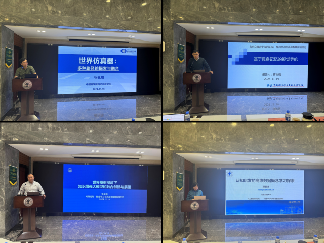 19日,中国科学院自动化所张兆翔研究员以“世界仿真器:多路径的探索与融合大模型技术”为题,分享了其团队在世界仿真器相关路线上的初步探索及应用落地成效。中国科学院计算所蒋树强研究员以“基于具身记忆的视觉导航”为题,分享了其团队在具身导航的最新研究方向及进展,并进行了虚拟到现实环境的演示。同济大学王昊奋研究员以“世界模型角度下知识增强大模型的融合创新与展望”为题,分析了世界模型和知识增强大模型前沿研究案例和最新技术发展趋势,并结合垂直领域的落地应用展望了未来技术范式。H动画 景丽萍教授以“认知启发的高维数据概念学习探索”为题,从心理学与认知科学角度出发,探索高维数据概念表示、学习和解释理论和方法,并对认知启发的概念学习进行了展望。